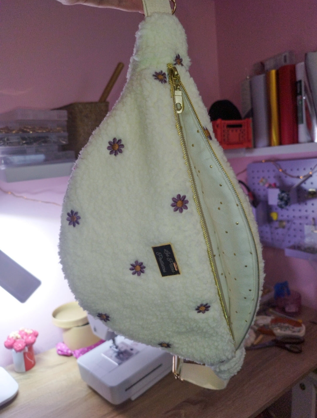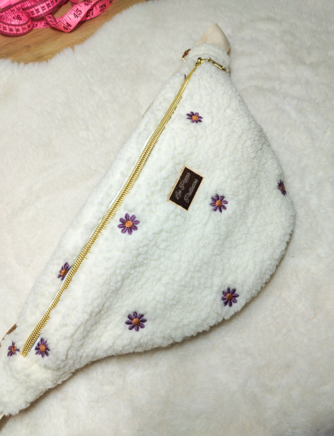 Élégante et résolument tendance, cette banane en moumoute séduit par son toucher ultra doux et son design raffiné. Son tissu sherpa, délicatement orné de motifs cœur, apporte une note chaleureuse et sophistiquée, tandis que son intérieur en coton blanc à pois dorés illumine l’ensemble avec subtilité.